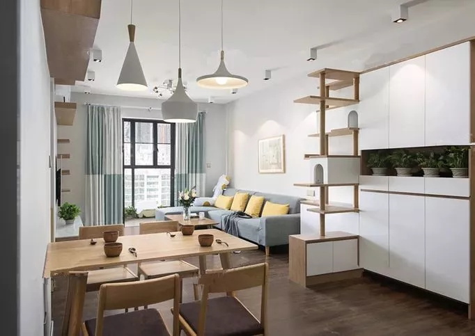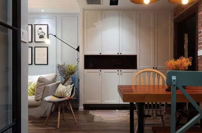 如果進門左邊餐廳右邊客廳,直接設計和墻垂直的玄關柜的話,不僅會讓兩邊的空間都顯得非常窄,而且也會阻擋室內光線,但如果將柜子靠墻設置就能解決這個問題。