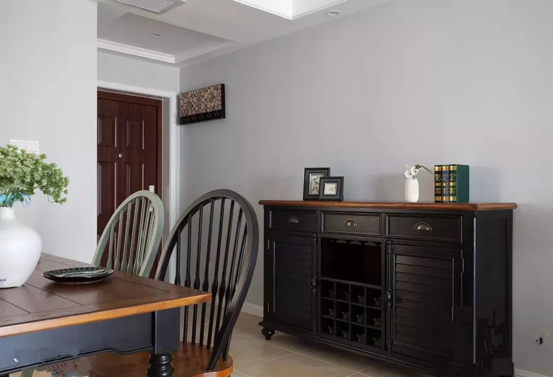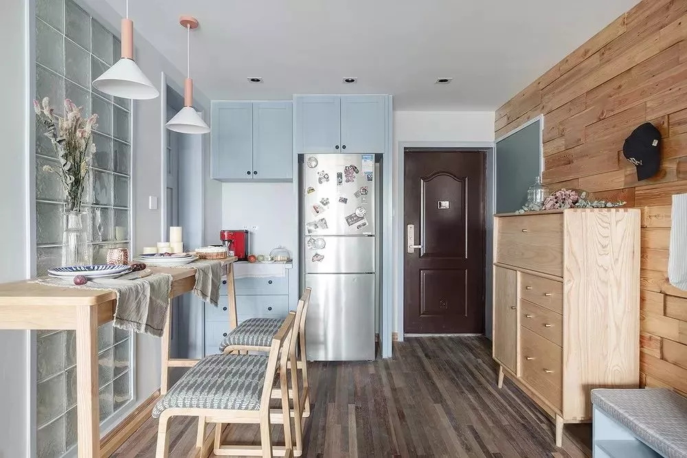 進門就是餐廳的話,由于大門太靠近這一側的墻壁,做大柜子會阻礙空間動線,所以只能在大門右側擺放小體量的鞋柜。