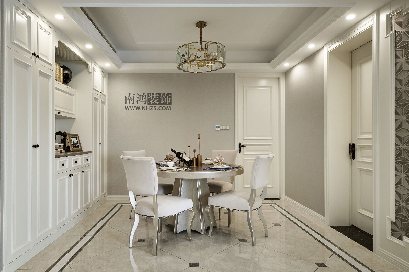 餐廳的一面墻壁定制了餐邊柜,具有很強的收納功用,配以圓形黑色拉手,造型簡約時尚。米白色的絨質餐椅為日常用餐注入了暖意。
