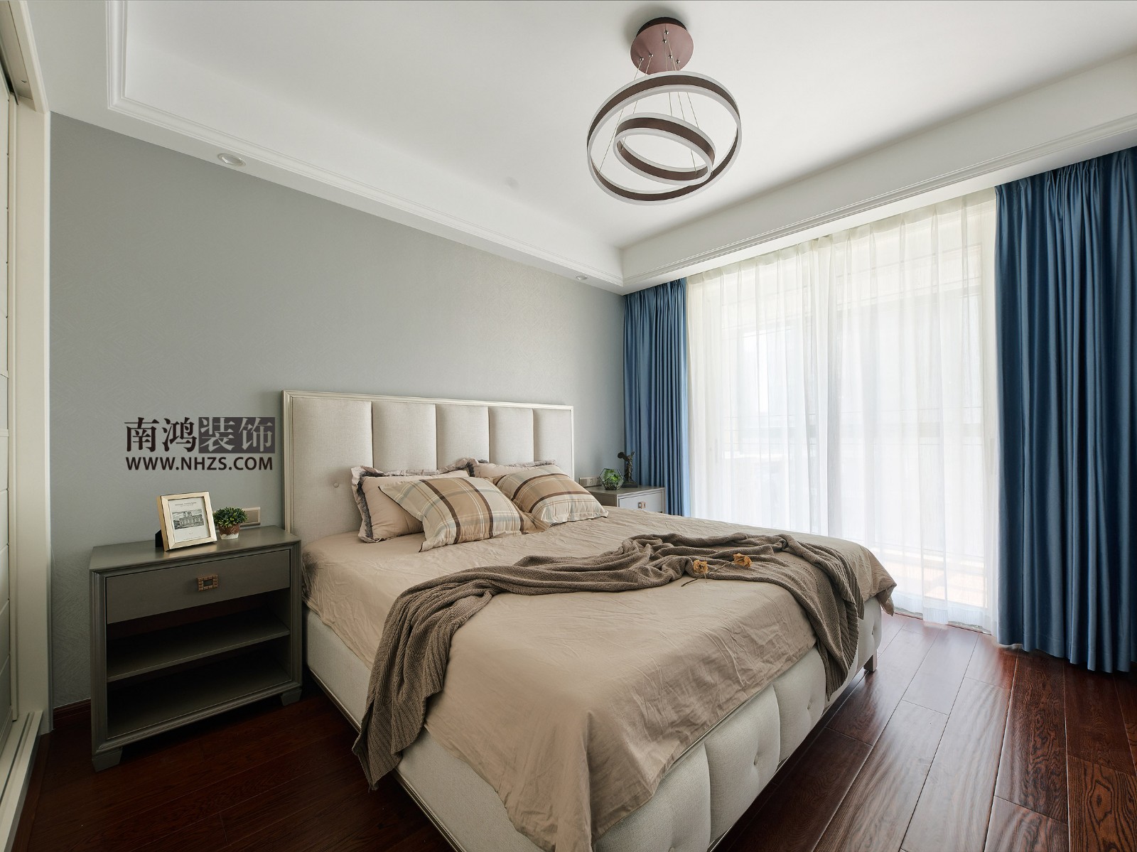 次臥是一個低調沉穩的灰色空間,無論是頂部的藝術吊燈,還是深灰色的床頭柜,造型都非常簡約。落地窗為室內導入通透光線,顯得清爽而透亮。