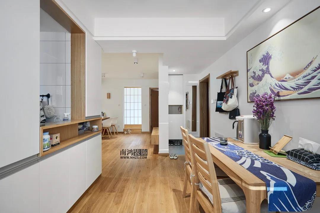以白色背景為主,搭配木質(zhì)家具的日式風(fēng)餐廳,通過原木風(fēng)的餐桌椅和木白結(jié)合的餐邊柜,來展現(xiàn)日系的治愈基調(diào)。
