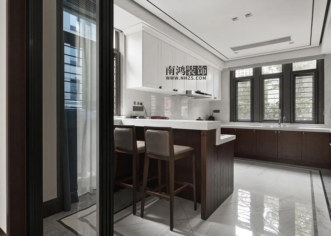 廚房,白色吊柜搭配木質地柜,細致莊重,現代化的內嵌廚電打造出設備齊全的料理空間,靠門一側還設計了吧臺。