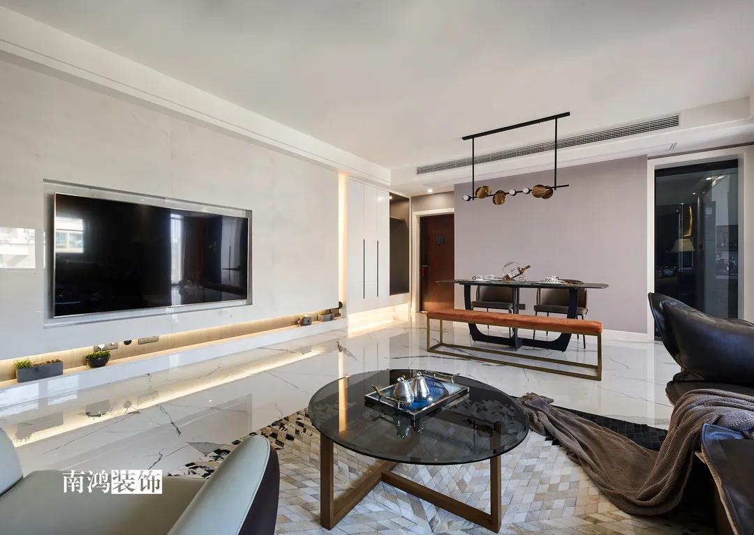 ▲客廳呈開放式布局,家具間不同材質的碰撞,打造輕盈時尚的生活環境。電視背景墻以地臺取代傳統電視柜,視覺效果統一大氣。